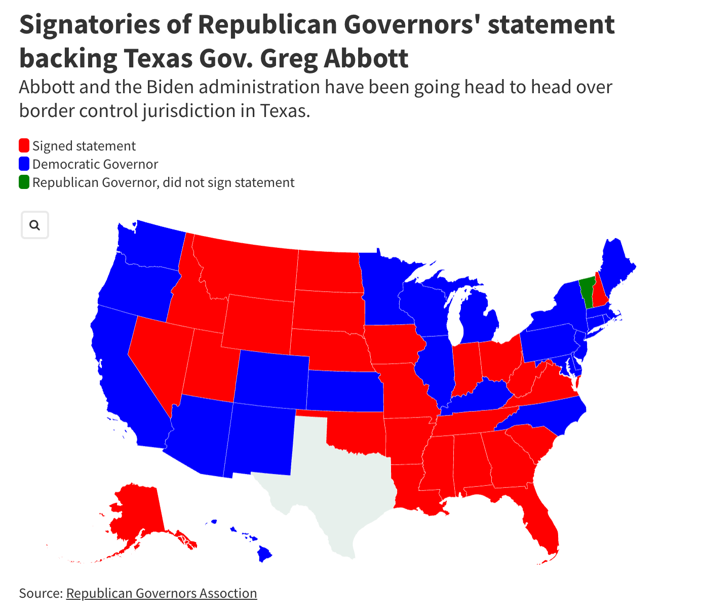 Every Republican governor save for Vermont moderate Gov. Phil Scott signed on to a letter on Thursday backing Texas in its fight against the federal government. Failed presidential candidate Ron DeSantis attempted to provide context with an obnoxious selfie video that makes you question whether he’d ever used an iPhone before, members of Congress discussed taking the national budget hostage to prevent the federal government from asserting its power, and zealot House Speaker Mike Johnson has encouraged Abbott to keep it going as well.