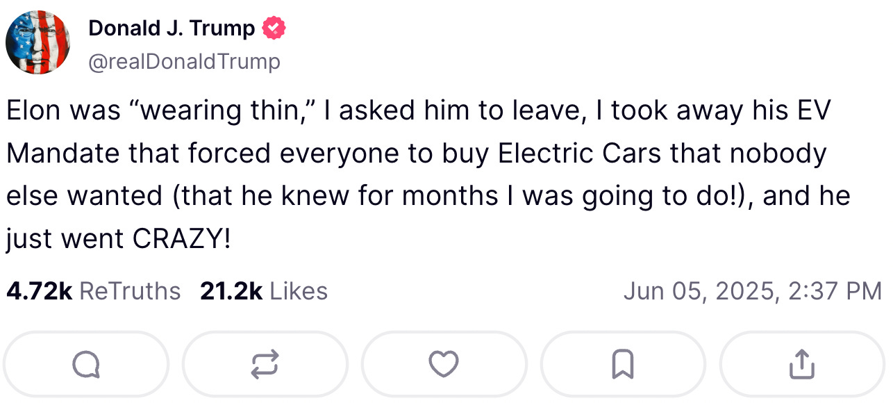 In any sane world, this would be TMZ fodder, with Trump and Musk nothing more than two wealthy racists with too much time and not enough oxygen flowing to their brains. Instead, it’s the President of the United States vs. the World’s Richest Man, in a fight triggered by Hindenburg-sized egos and how much money they can soak from the rest of us. Though he swears this isn’t the case, Musk’s is undoubtedly angry over the reconciliation bill’s axing of various tax credits that enrich his businesses (and Trump withdrawing his buddy’s nomination to run NASA).