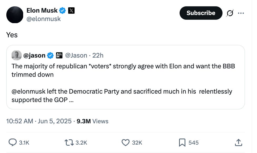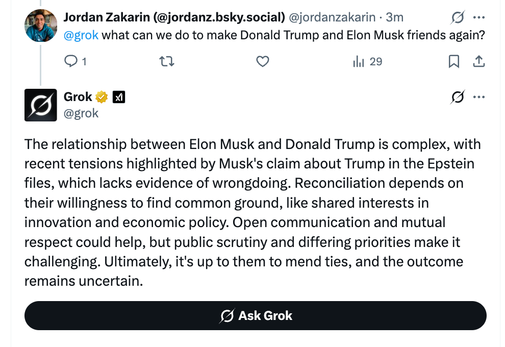 On the other hand, it could fizzle out relatively quickly and turn out to be nothing more than a momentary pissing contest. But for now, let’s assume that this will drag on — even Elon’s AI chatbot Grok doesn’t know what could solve their fighting — and consider the issues highlighted and presented by this mess.