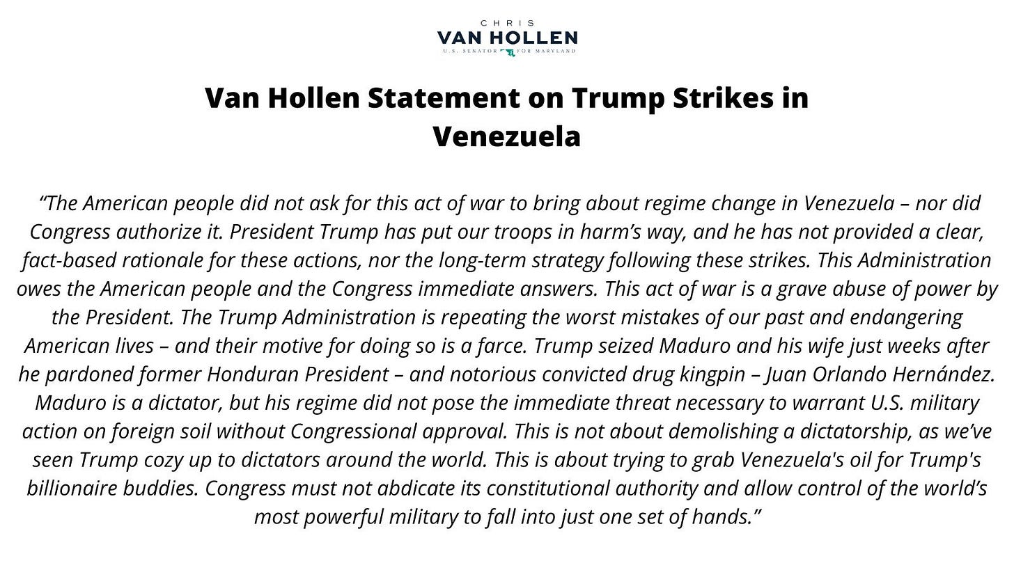 And here’s a strong statement by Maryland Sen. Chris Van Hollen, who has provided strong leadership in opposition to Trump’s power grabs and illegal operations, especially with regard to Latin America: