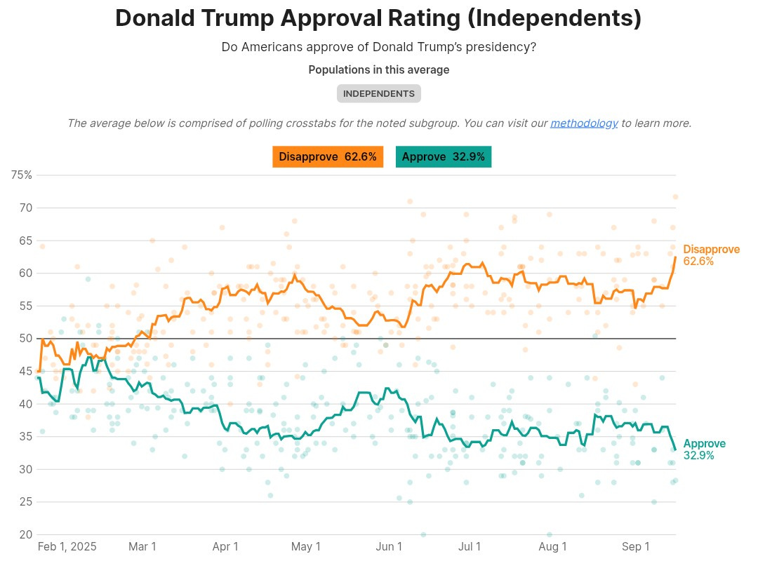 According to Decision Desk HQ’s poll average, Trump just hit his lowest point yet with independent voters, sinking to 27.5 points below water, a 28-point swing from his high point in February.