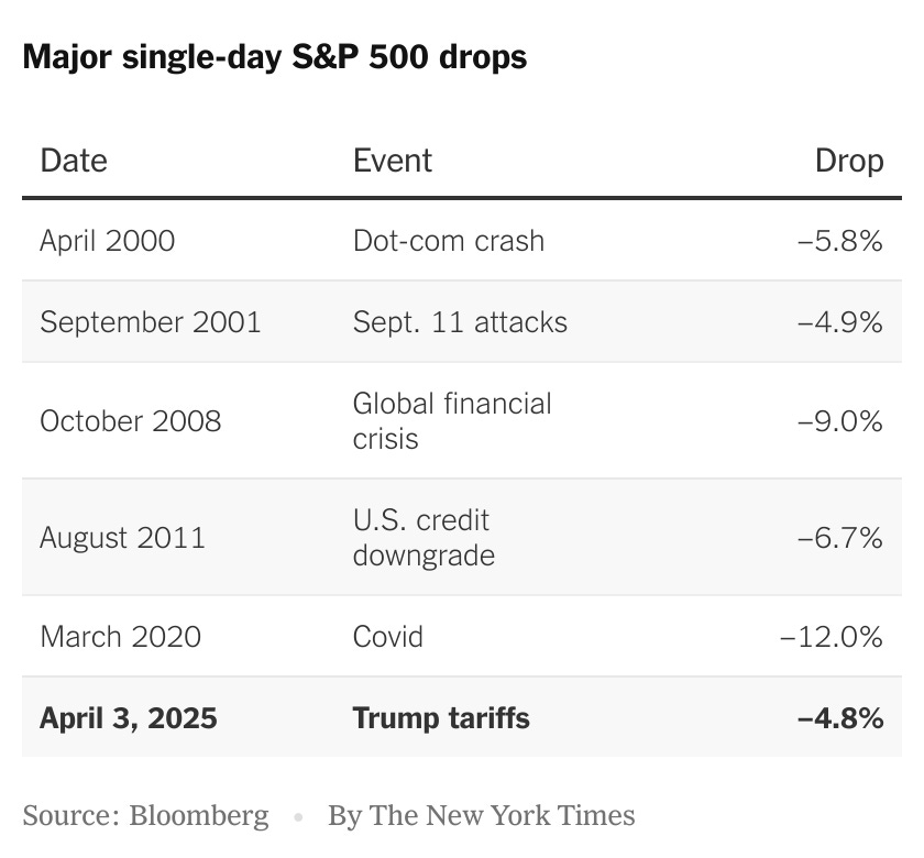It got worse on Friday, as the Dow Jones dropped another 6% in response to Trump’s tariffs, which journalists and financial experts quickly recognized were based on a less-than-rudimentary understanding of global trade, calculated with toddler-like precision, and informed by zero real-world context.