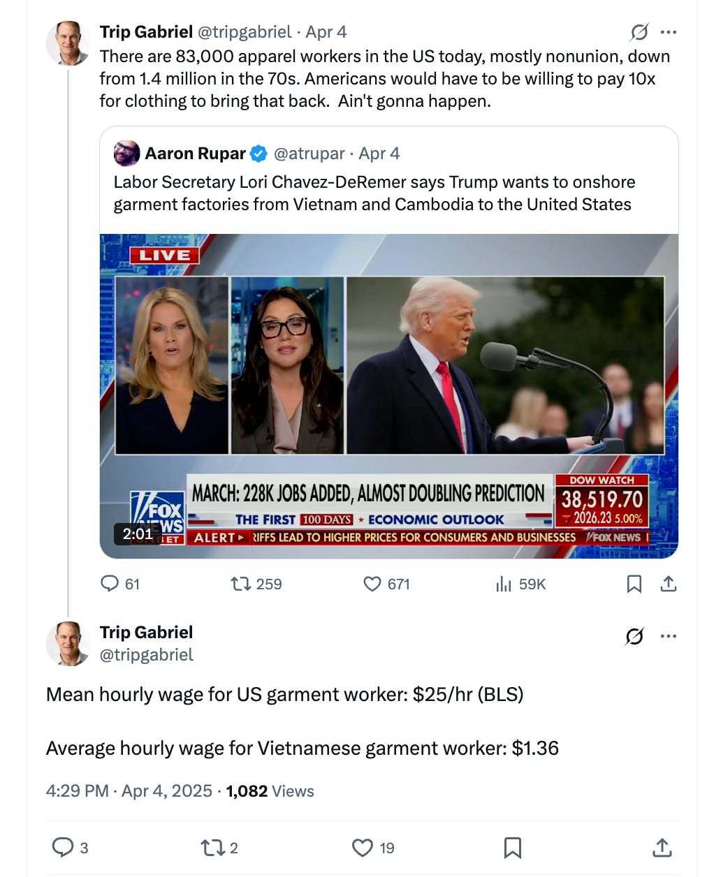 Perhaps even more disconcerting is the glib responses I’ve seen from many liberal Democrats who question the general idea of reshoring domestic production of certain goods, as if it’s a net positive that companies can manufacture things in dangerous factories that pay poverty wages.