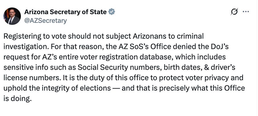 The biggest red flag, however, is the DOJ’s request for data going all the way back to 2020, when Arizona was at the center of a conservative-manufactured firestorm over fanciful allegations of voter fraud. The New York Times has reported that the DOJ wants to create a national database to “prove” Trump’s fantasy that huge numbers of undocumented immigrants voted in the 2020 election, and concerns about legality are not on its radar.