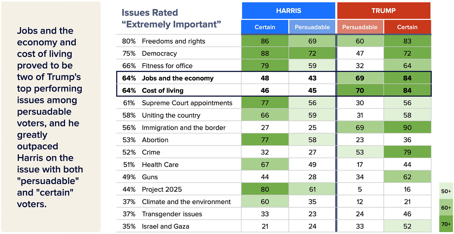Further, the study found 22% of voters were persuadable into the final stretch, and that they were predominantly men under 45, people of color, and self-described moderates. They broke for Trump by ten points, and were most concerned about the economy, not democracy or character — the exact things that Harris campaigned on in October.