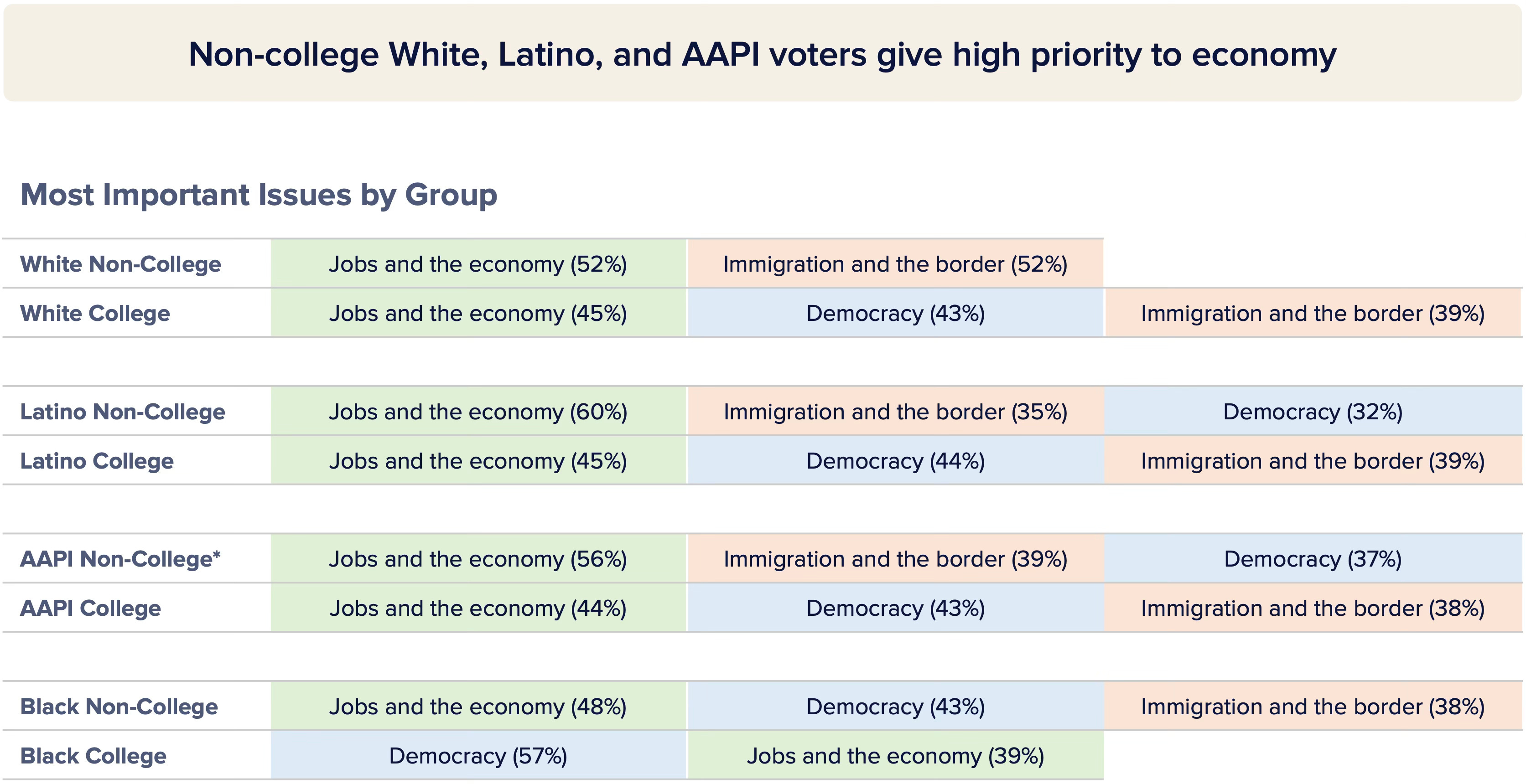 “Jobs and the economy proved to be the most motivating issue across race and education,” the group wrote in the study’s top-line summary. “The only voters who prioritized democracy over jobs and the economy were college-educated Black voters. Non-college Black voters along with college and non-college white, Latino, and AAPI voters all centered jobs and the economy as their top issue.”