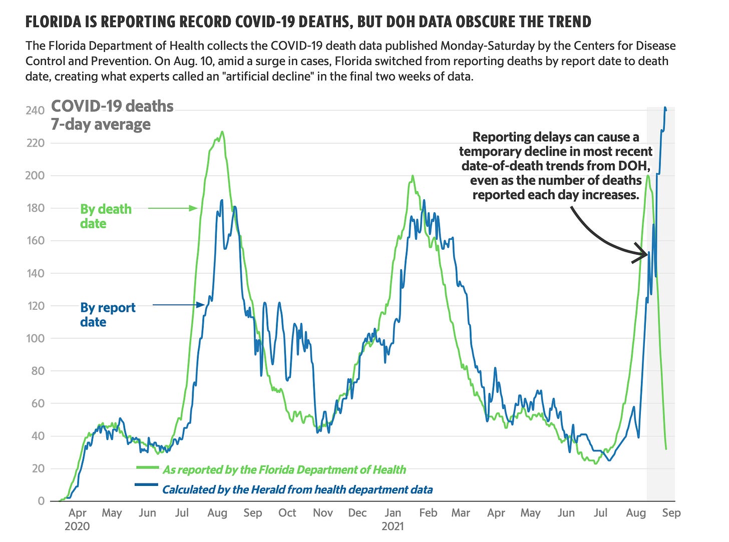You would be forgiven for reading this and thinking that DeSantis has had nothing to do with the deadly surge devastating the state he runs — he’s “staying the course,” the Times explains, as if fostering incessant human tragedy is some normal course of action. I wonder if DeSantis administration’s ghastly attempt to cover up the sheer enormity of the surge in deaths also qualifies as “staying the course.” Perhaps the Times will update their story to reflect the lawsuit filed by state Rep. Carlos Smith today in an effort to compel force DeSantis to cough up some more of the data he’s hiding.