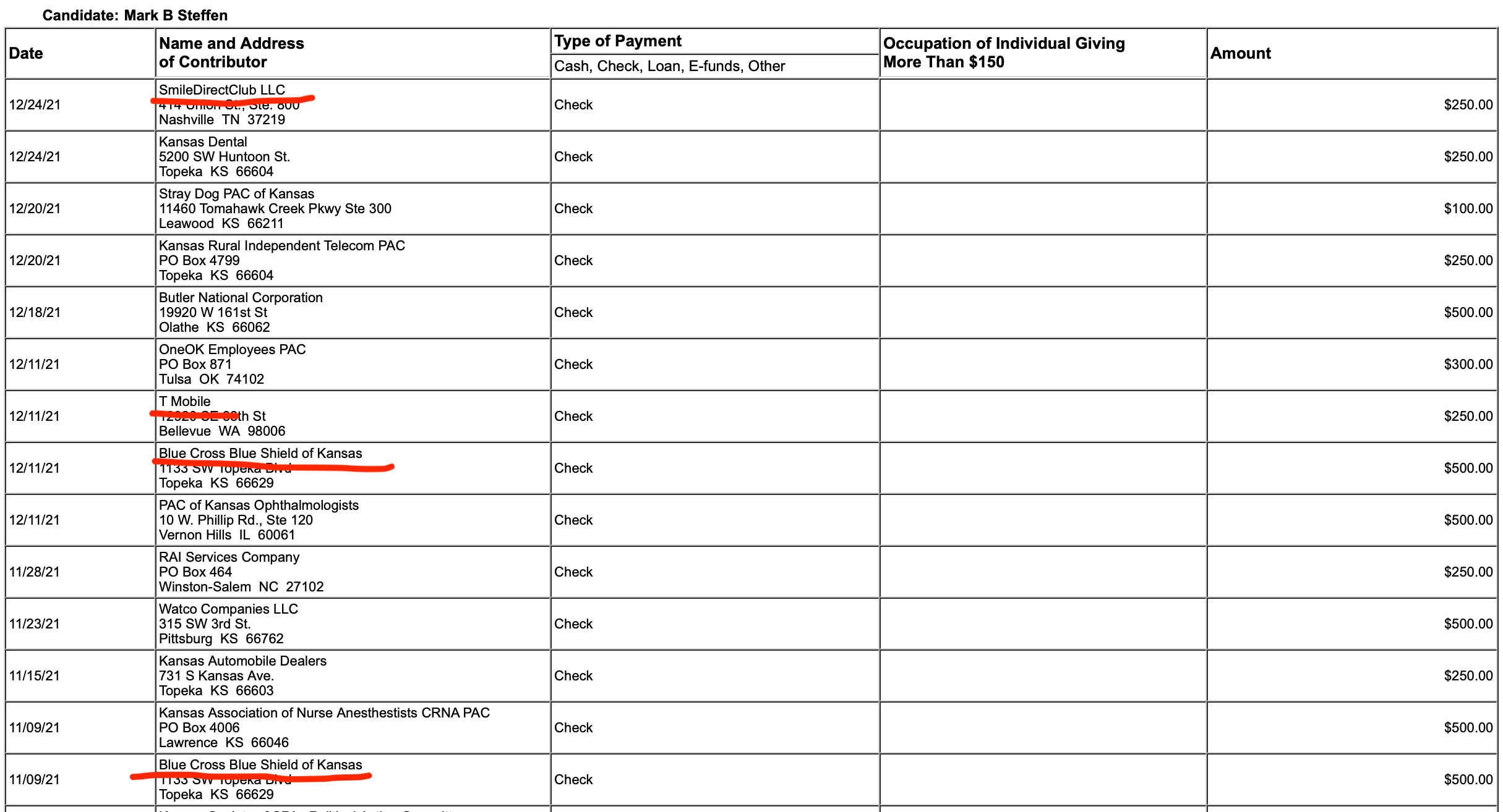 In his last campaign fundraising filing, submitted in January to the Kansas Secretary of State’s office, Steffen listed sizable donations from a number of well-known companies, including some in the medical treatment space. Headliner names include insurer Blue Cross Blue Shield, Smile Direct Club, and T-Mobile, which all sent him donations even after he had spent the entire fall campaigning and holding hearings about ivermectin and the “dangers” of vaccines.