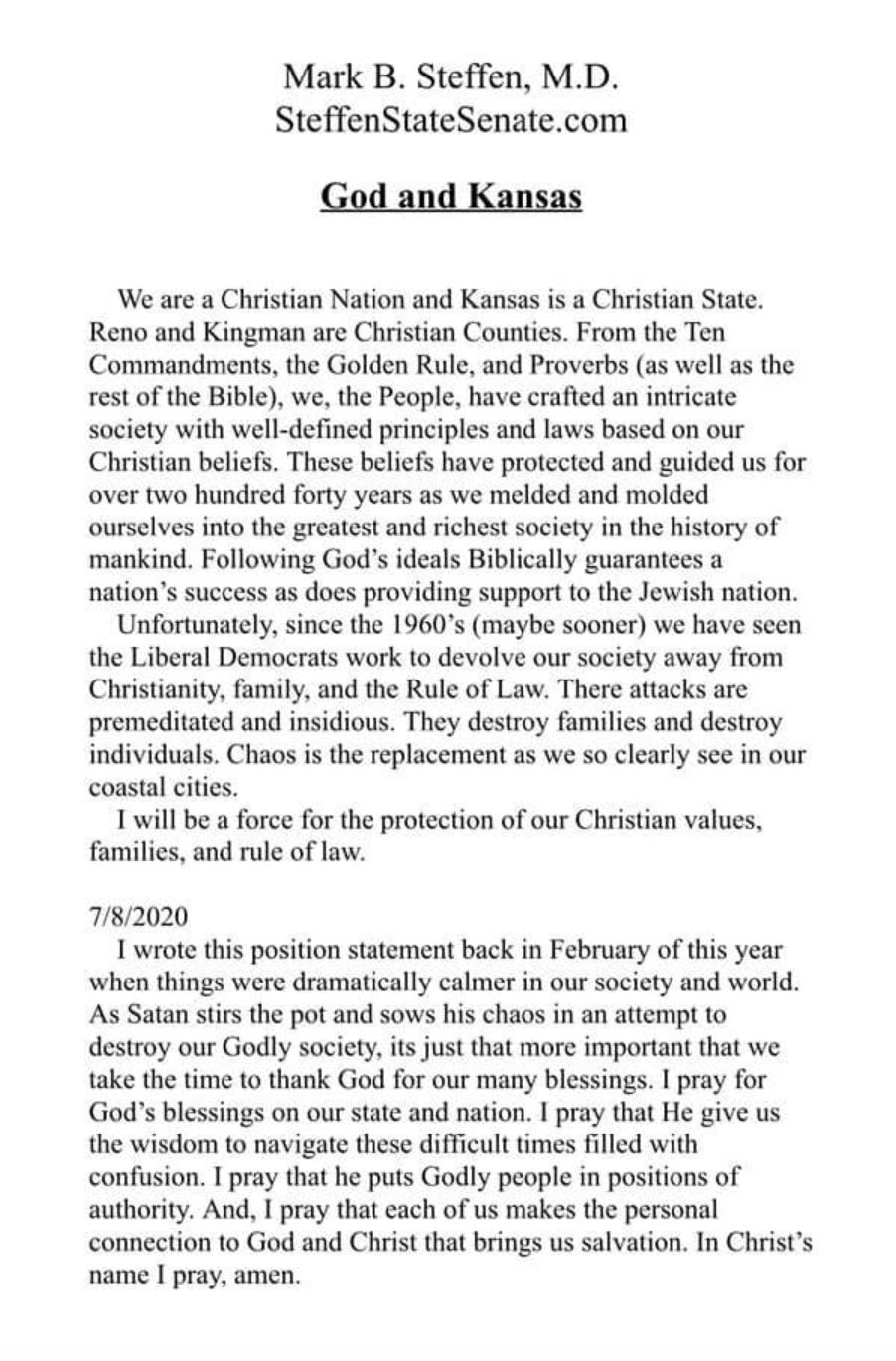 Steffen served for a short period in 2020 as a member of the Reno County Commission, where he fought hard to promote ivermectin and other sham Covid treatments. He also ran a campaign that opposed the use of masks even before the vaccine was developed, was virulently anti-abortion, and promised to bring “God, family, and true conservatism” to government (it was literally his campaign slogan).