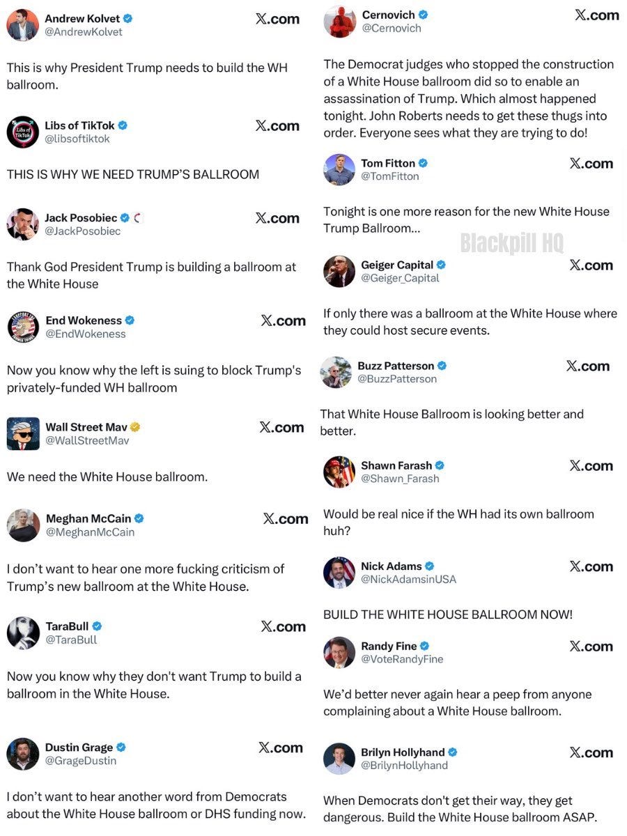 A screeching chorus of right wing influencers calling the incident evidence that Trump’s White House grandiose ballroom must be built