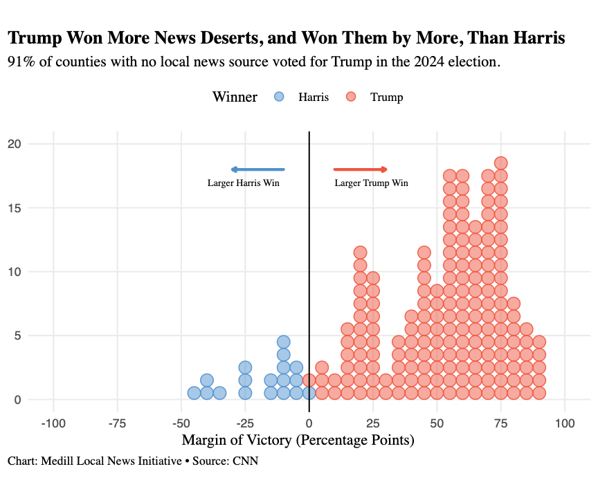 Donald Trump won the 2024 election with one of the smallest popular-vote margins in U.S. history, but in news deserts – counties lacking a professional source of local news – it was an avalanche. Trump won 91% percent of these counties over his Democratic rival, Kamala Harris, according to an analysis of voting data by Medill Journalism School’s State of Local News project.