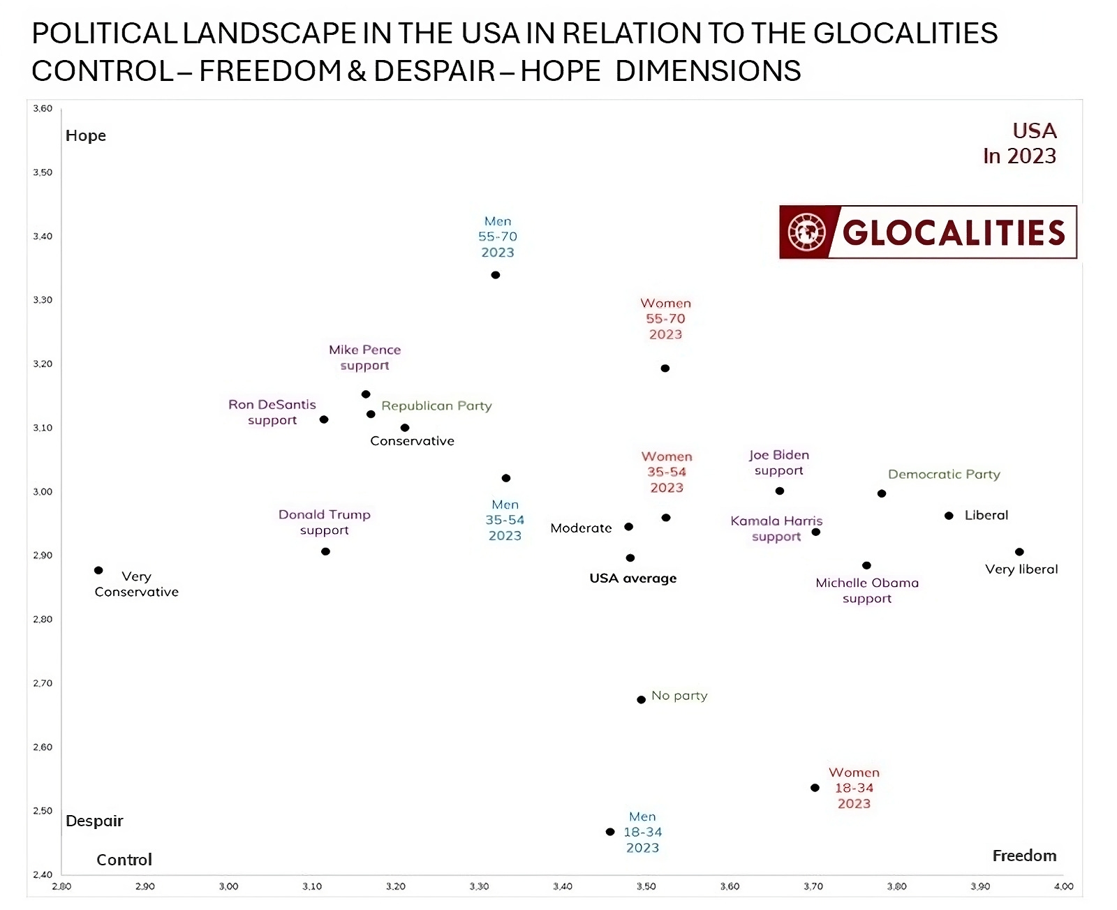 Research has shown that the Freedom and Control axis has a strong correlation with political beliefs, while Hope and Despair are more indicative of personal outlook and sentiment.