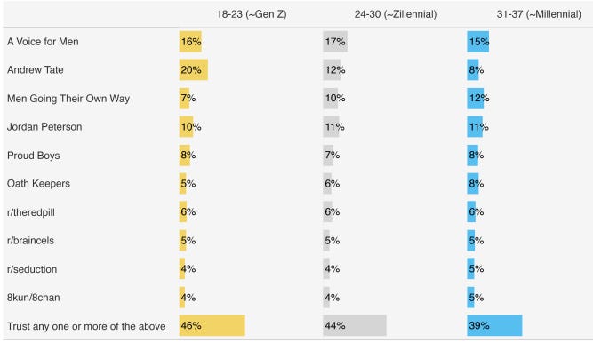 In search for meaning and empathy, they often turn to right-wing media figures who have aggressively sought to define manhood as “white, militaristic, and often gun-owning,” the report states. Fully 40% of all respondents said that they trusted alt-right influencers who back “men’s rights” and reject wokeness.