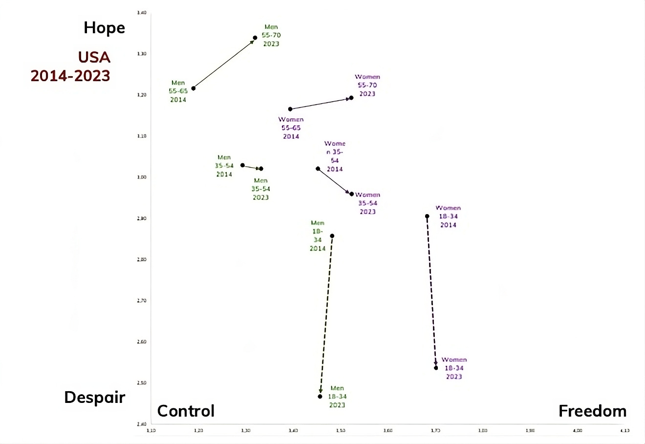 Young American women who participated in the survey avoided the same shift toward conservatism, but experienced a similar sense of despair over the past decade.