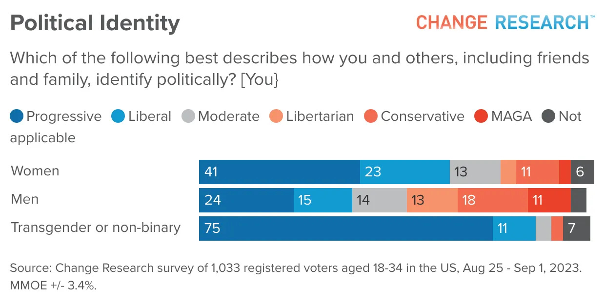 A poll conducted by Change Research and released this winter (see above) honed in on more specific political identity can help us understand with more nuance where voters are right now. Nearly 40% of men identified themselves as progressive (24%) or liberal (15%), while 18% said that they were conservative, 111% identified as MAGA, and 13% called themselves libertarians (a fake identity that eventually gives way to right-wing sympathies.